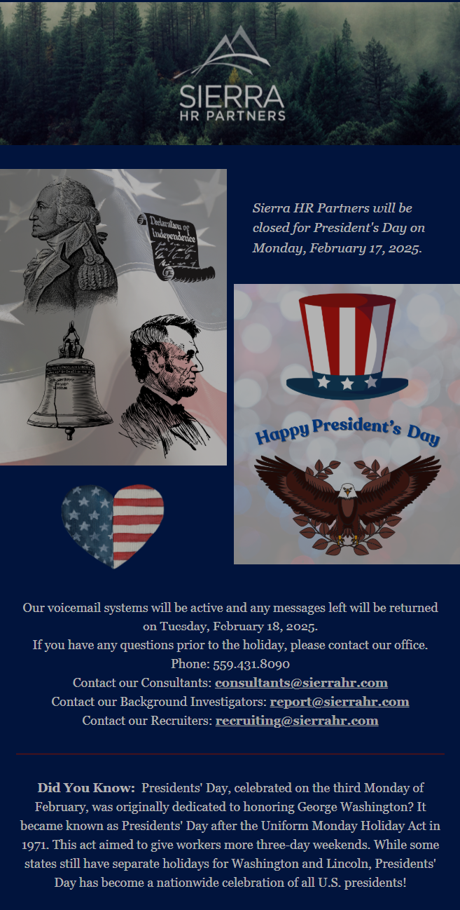 « All Events This event has passed. Office Closed – President’s Day February 17 @ 8:00 am - 5:00 pm « HR Building Blocks #1: Employee Handbooks Harassment Prevention for Supervisors – Webinar » Add to calendar Google Calendar iCalendar Outlook 365 Outlook Live Details Date: February 17 Time: 8:00 am - 5:00 pm Event Category: office closure